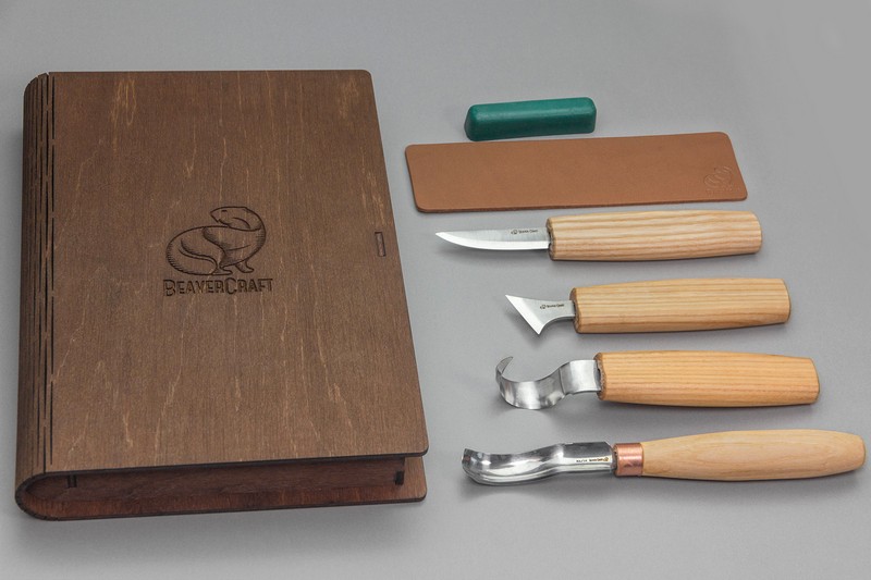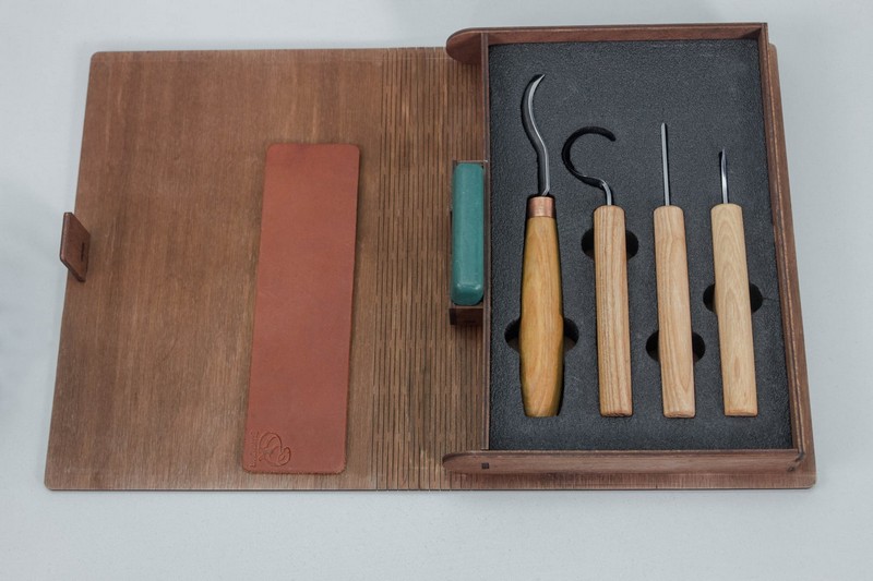 Tato sada 4 nožů by byla ideální pro začátečníky i pro profesionální řezbáře. A to v dárkovém balení – pouzdru ve formě knihy! Bylo by to nejlepší pro obecné řezbářství a pro detailní, jednoduchou práci. Materiál rukojeti nožů je jasan, napuštěný lněným olejem, který vydrží roky.