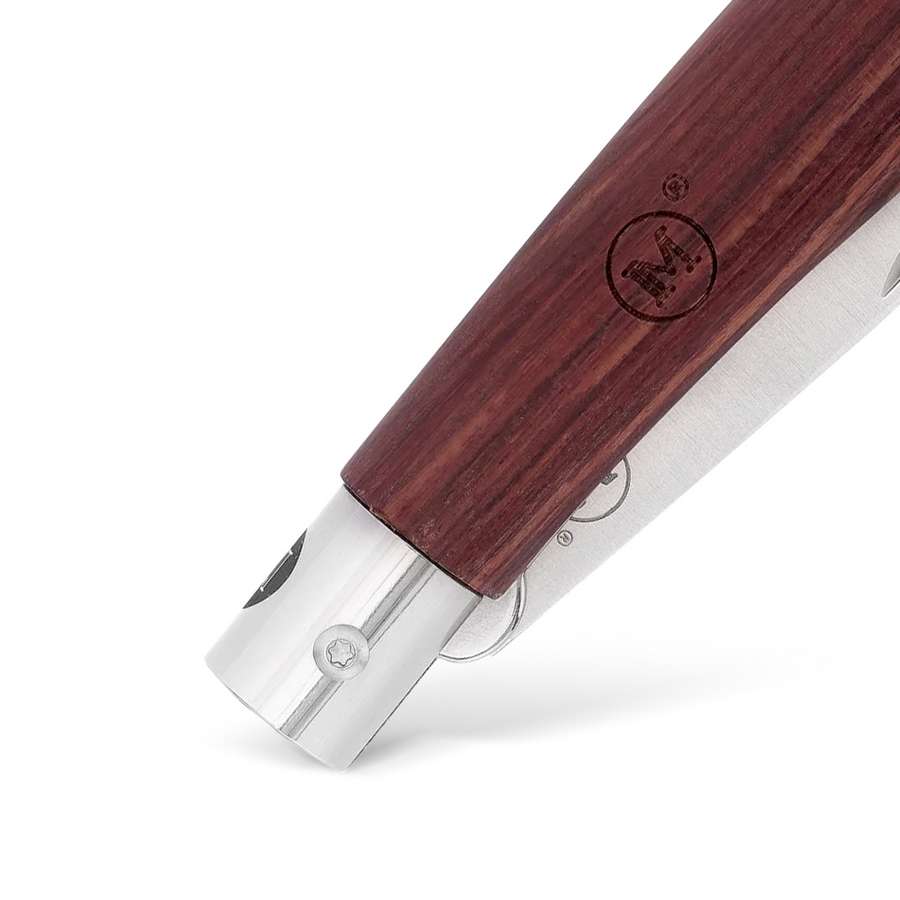 Rukojeť nože je vyrobena z exotického dřeva bubinga s hnědou barvou a krásně definovanou kresbou . Dřevo prošlo speciální úpravou, aby se zabránilo absorpci vlhkosti. Během procesu přípravy rukojeti bylo její konečné textury dosaženo ručním leštěním. Leštění odstraňuje veškeré nedokonalosti a zajišťuje hladkou rukojeť na dotek. Ocelový kroužek obepínající dřevěnou konstrukci slouží jako spojovací prvek mezi dřevěnou rukojetí a čepelí .